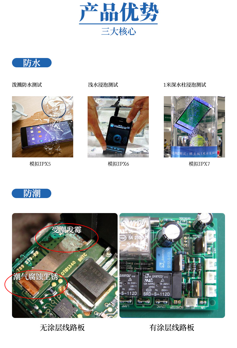 企业专注于氟改性聚酯纳米涂层材料研发制造与电子防护整体解决方案供应,在精密电子制造工艺中为PCBA提供360度全方位防水、防潮、防腐蚀的纳米涂层保护,高效提升线路板在潮湿环境运行稳定性及降低故障售后率,是户外产品结构防水的黄金搭档,消费类电子一键防水、防盐雾的好帮手。