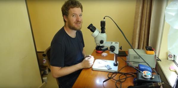 他必须从lightning插孔后边把电源电路跟耳机插头电焊焊接通,下面的图是小伙在显微镜下电焊焊接电源电路,七根线一根都不可以电焊焊接错
