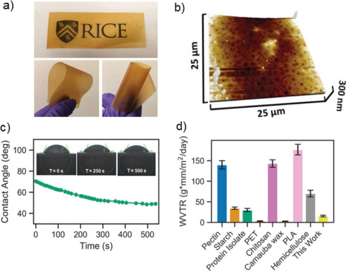通过对自支撑的纳米复合薄膜进行实验,研究了纳米复合涂层对水果保鲜的机理。这种薄膜非常柔韧,可以反复弯曲和折叠而不会断裂,良好的机械性能是该薄膜作为水果涂层的基本要求之一,以防止在搬运和储存过程中过早失效或开裂。通过测量纳米复合薄膜的水蒸汽传递速率,了解了涂层防腐和除湿的能力。其水蒸汽传递速率为~15 g mm m−2 day−1,远低于壳聚糖、聚乳酸(PLA)、果胶、分离蛋白等其他常用的包装用生物聚合物。低的水蒸汽传递速率表明,涂层为水果提供了一个水汽屏障,使水分更有效地保留在水果中。