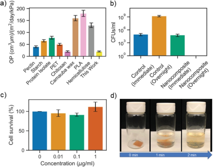 还使用大肠杆菌菌株评估了涂层的抗菌性能,因为已知微生物的生长有助于水果的易腐性。尽管立即暴露在涂层薄膜上不会降低细菌的滴度,但在薄膜上孵育一晚后,细菌的滴度为零。这表明,该膜可在24小时内有效消除细菌在表面上的生长,强大的抗菌活性,可减少新鲜农产品的软腐,并增强食用安全性。
